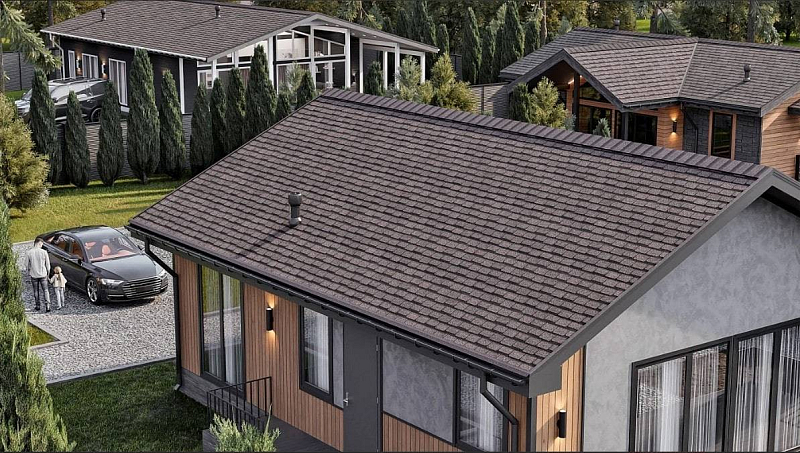 Лепестки разной высоты задают ритм на кровле и придают 3Д эффект, наполненный глубиной и игрой теней при взгляде на дом.